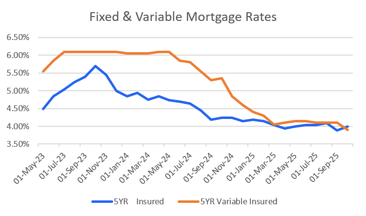 Variable rates are only slightly higher than fixed rates. One more rate cut and they will finally fall below fixed rates once again. Our best national insured, five-year, variable mortgage rate is 4.10%.